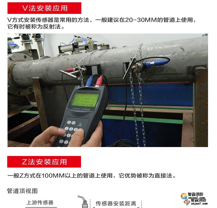 超聲波流量計(jì)的傳感器一般采用V方式和Z方式安裝,通常情況下,管徑小于300mm時(shí),采用V方式安裝,管徑大于200mm時(shí),采用Z方式安裝。對(duì)于即可以用V方式安裝又可以Z方式安裝的傳感器,盡量選用Z方式。實(shí)踐表明,Z方式安裝的傳感器超聲波信號(hào)強(qiáng)度高,測(cè)量的穩(wěn)定性也好,圖2。
