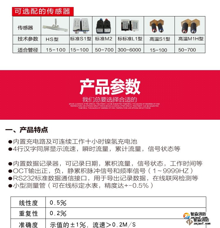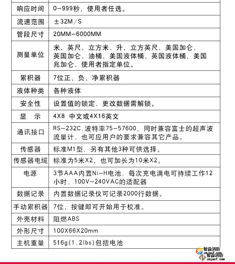超聲波流量計(jì)測(cè)量管徑范圍:0mm~300mm;WWW.XFJCYQ.COM精度:±1%用于檢測(cè)消火栓系統(tǒng)和水噴淋系統(tǒng)的給水量以及消防豎管的流量分配。